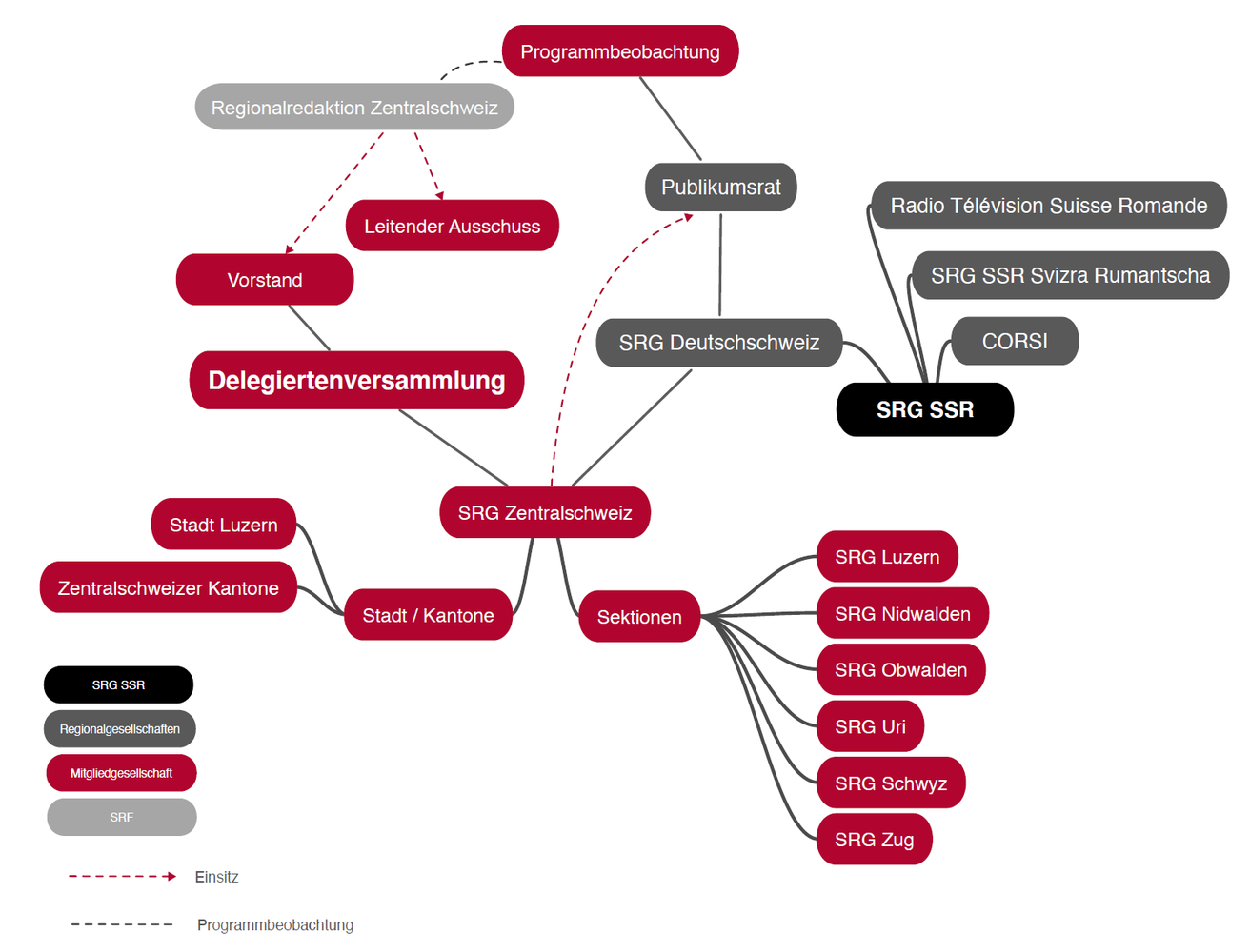 Die SRG Zentralschweiz ist eine Mitgliedgesellschaft der Regionalgesellschaft SRG Deutschschweiz. Sie ist mit 3 Regionalrätinnen und -räten im Regionalrat der SRG Deutschschweiz sowie mit 3 Delegierten in der Delegiertenversammlung der SRG, und zwei Zentralschweizer Mitgliedern im Publikumsrat der SRG Deutschschweiz vertreten.